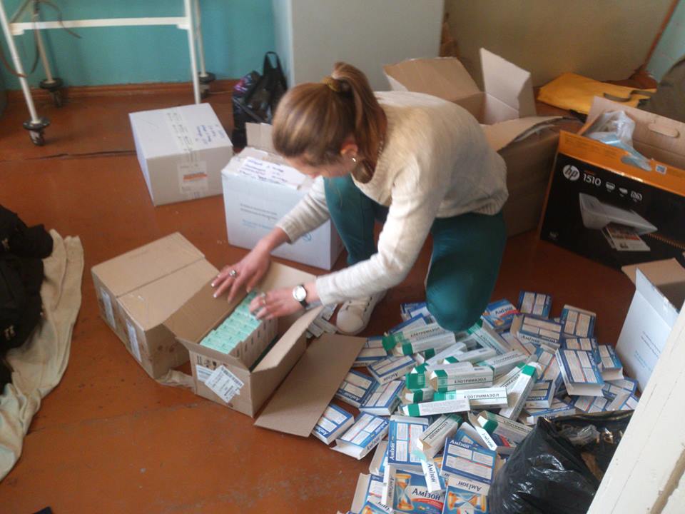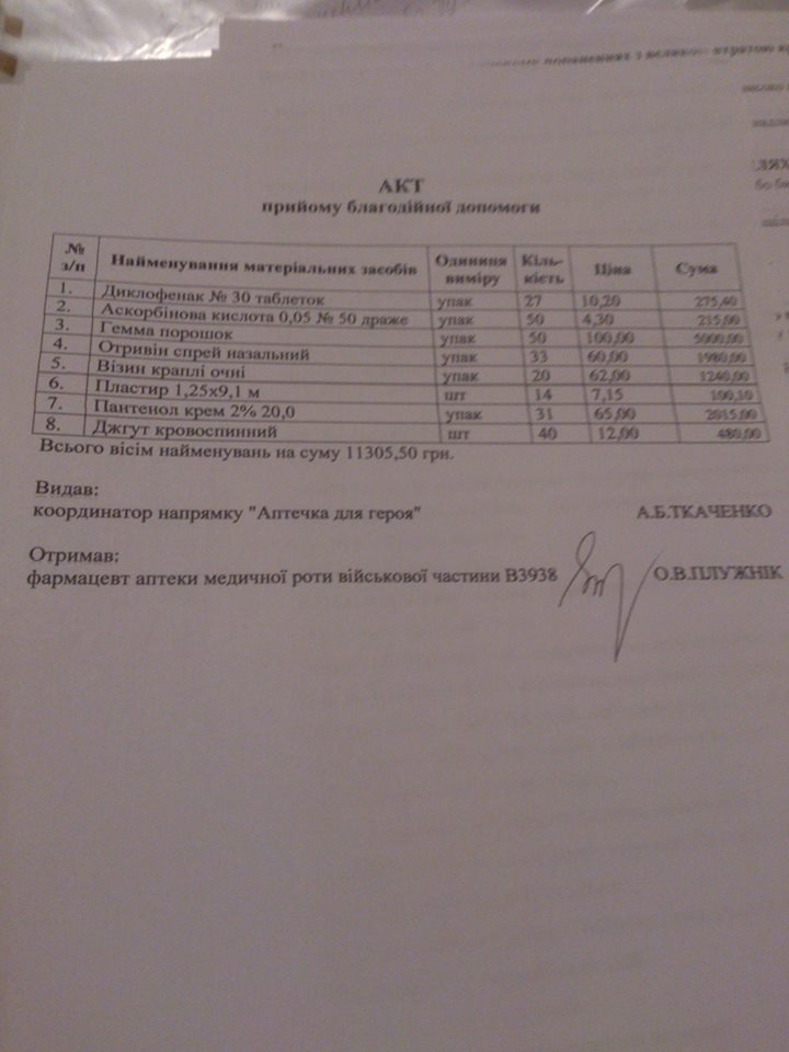 Спочатку у військову частину завдяки Anastasiya Serbina, Александра Фальчук та "Ліга меценатів" приїхали 200 аптечок з стерильними бинтами, стерильними серветками, еластичними бинтами, Налбуфіном в ампулах, джгутами, септефрілом та бромгексидином.