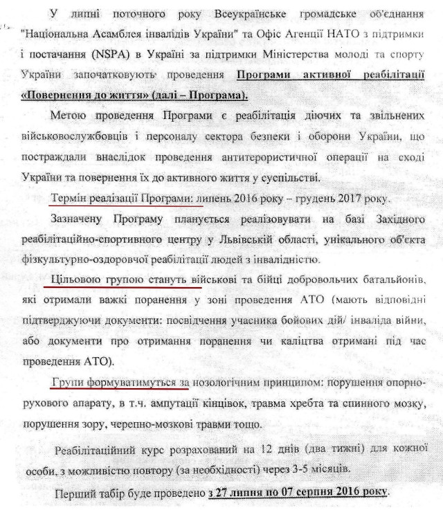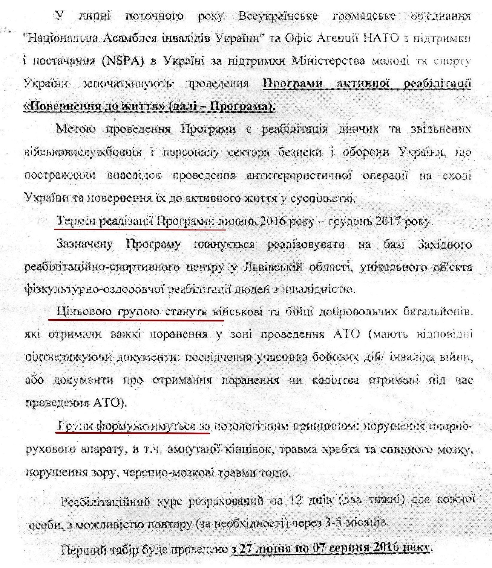 Це передбачено Програмою активної реабілітації "Повернення до життя". Метою Програми є реабілітація діючих та звільнених військовослужбовців, пepcoналу сектору безпеки і оборони України, які постраждали внаслідок проведення антитерористичної операції на сході України та повернення їх до активного життя у суспільстві.
