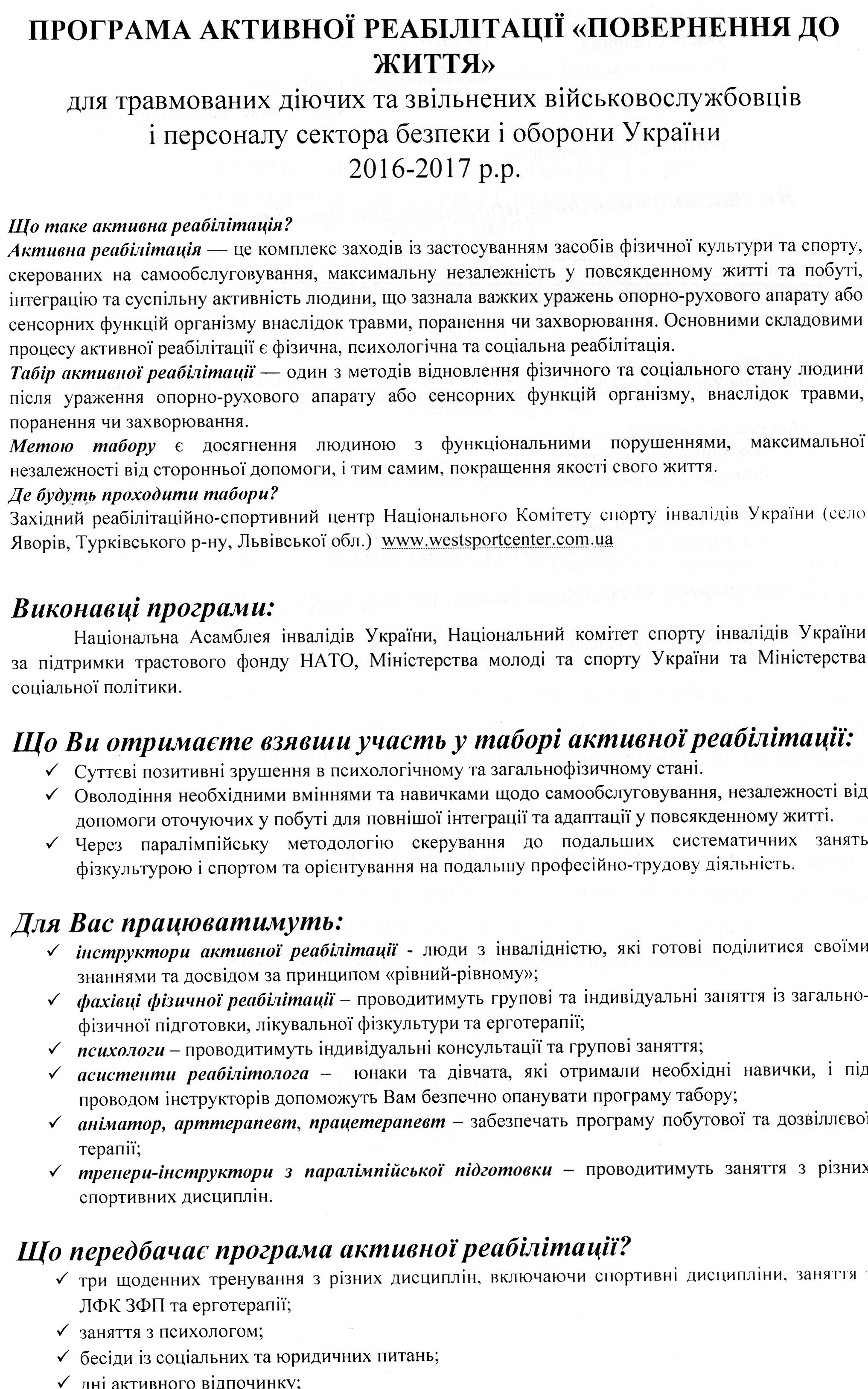 Для них пропонують табори активного відпочинку, метою яких є досягнення людиною з функціональними порушеннями, максимальної незалежності від сторонньої допомоги, i тим самим, покращення якості свого життя. Табори будуть проходити в Західному реабілітаційно-спортивному центрі Національного Комітету спорту інвалідів України (село Яворів, Турківського району, Львівcької обл.) www.westsportcenter.com.ua.