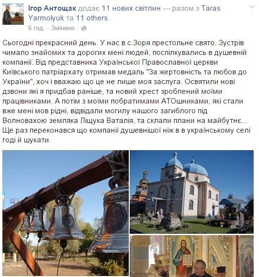 «Сьогодні прекрасний день. У нас в селі Зоря престольне свято. Зустрів чимало знайомих та дорогих мені людей, поспілкувались в душевній компанії. Від представника Української Православної церкви Київського патріархату отримав медаль «За жертовність та любов до України», хоч і вважаю, що це не лише моя заслуга», – йдеться у повідомленні.
