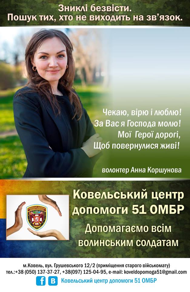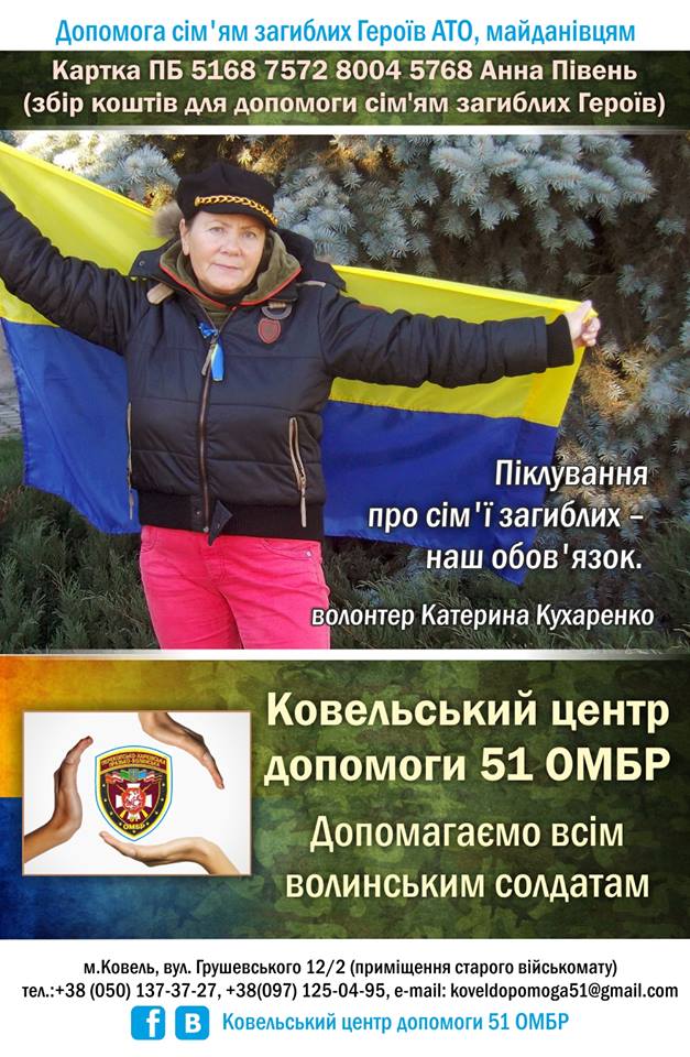 Ковельський центр допомоги бійцям 51 бригади займається пошуком полоненим, забезпеченням бійців продуктами, амуніцією. У рамках різних проектів здійснюється збір коштів для сімей військових, які беруть участь в АТО або загинули. Відтак, тепер кожен небайдужий волинянин може сам обрати напрямок допомоги. Про це інформує Центр в мережі.