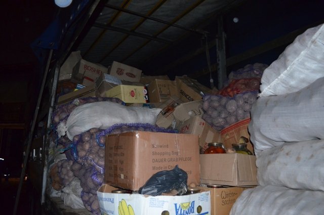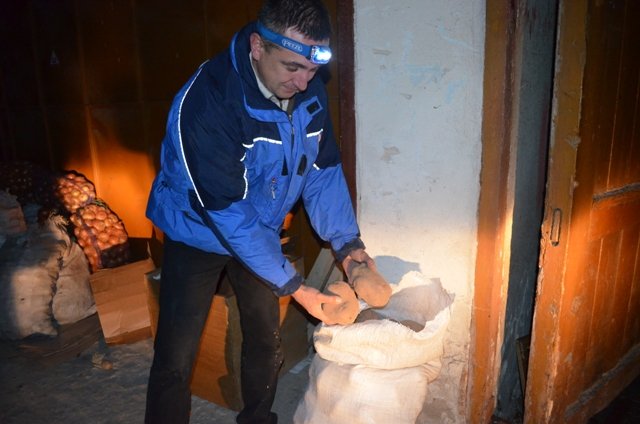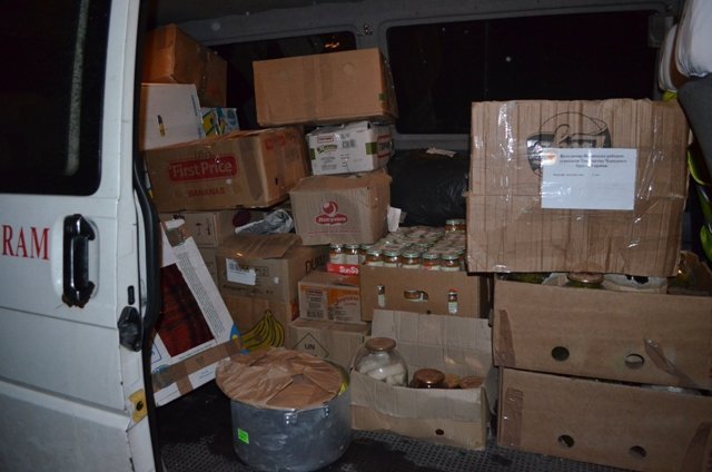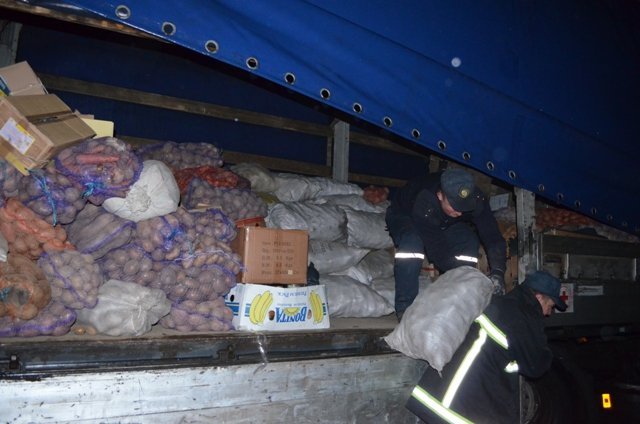 Багатотонний вантажний автомобіль для мешканців Сходу України заповнили мішками з картоплею, цибулею, консервацією, посудом та дитячим харчуванням.
