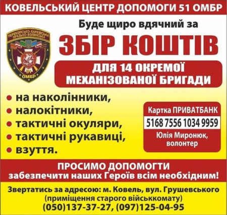 Волонтери проводять збір коштів для 14 окремої механізованої бригади. Зокрема кошти спрямують на закупівлю наколінників, налокітників, тактичних окулярів, рукавиць, взуття.
