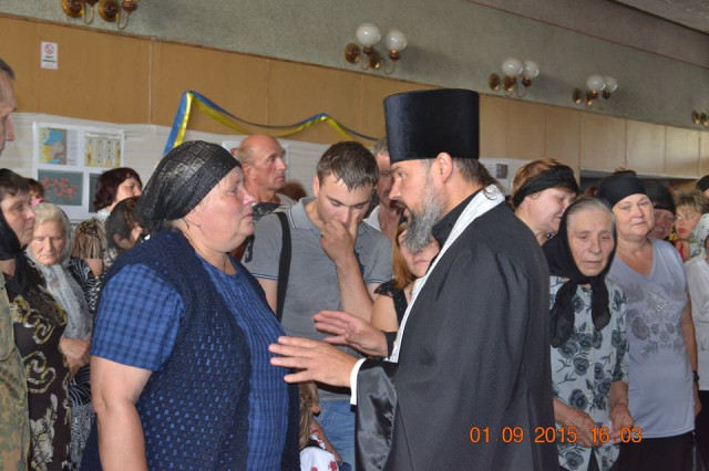Настоятелі Свято-Покровського храму митрофорні протоієреї Андрій та Василь відслужують панахиду за загиблим. Глибоко зворушують серце кожного присутнього слова отця Андрія.