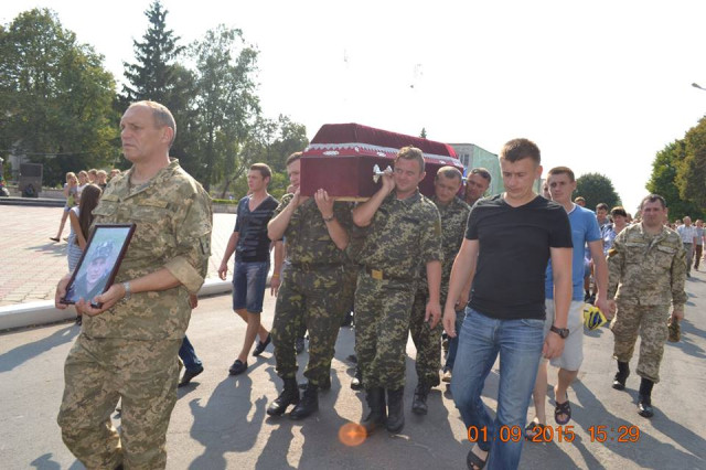 «Процесія за участю рідних, священнослужителів, воїнів АТО та всіх небайдужих повільно наближається до будинку «Просвіта», де встановлюється домовина.