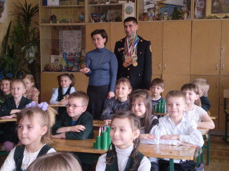 Чемпіон світу продемонстрував учням більш, як півсотні власних медалей, які дозволив поміряти та спробувати підняти однією рукою. Однак не всім першокласникам було під силу підняти стільки нагород.