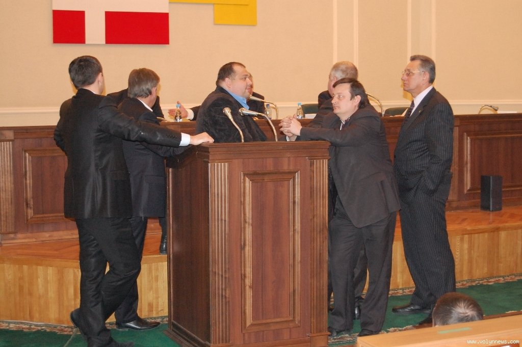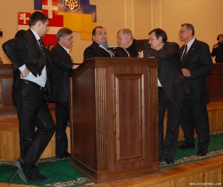 Депутати облради від ВО «Свобода» та партії «За Україну!» у вівторок, 15 лютого заблокували трибуну Волиньради, вимагаючи поставити на поіменне голосування питання про повернення «бандерівського рішення».