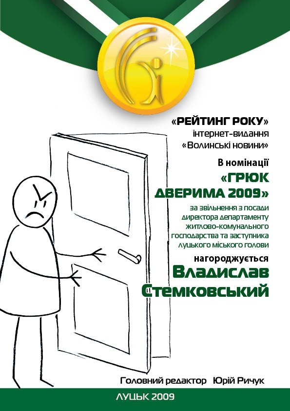 У номінації «Грюк дверима 2009» переміг Владислав Стемковський, який у серпні звільнився з посади директора департаменту житлово-комунального господарства та заступника луцького міського голови.