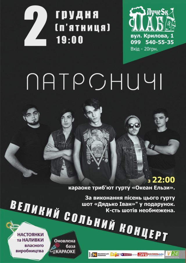 "2 грудня - гурт Патроничі повертається в Луцьк, щоб відіграти незабутній сольний концерт! Улюблені пісні, драйв і хороша атмосфера забезпечена! Приходьте і відчуйте", - запрошують організатори.