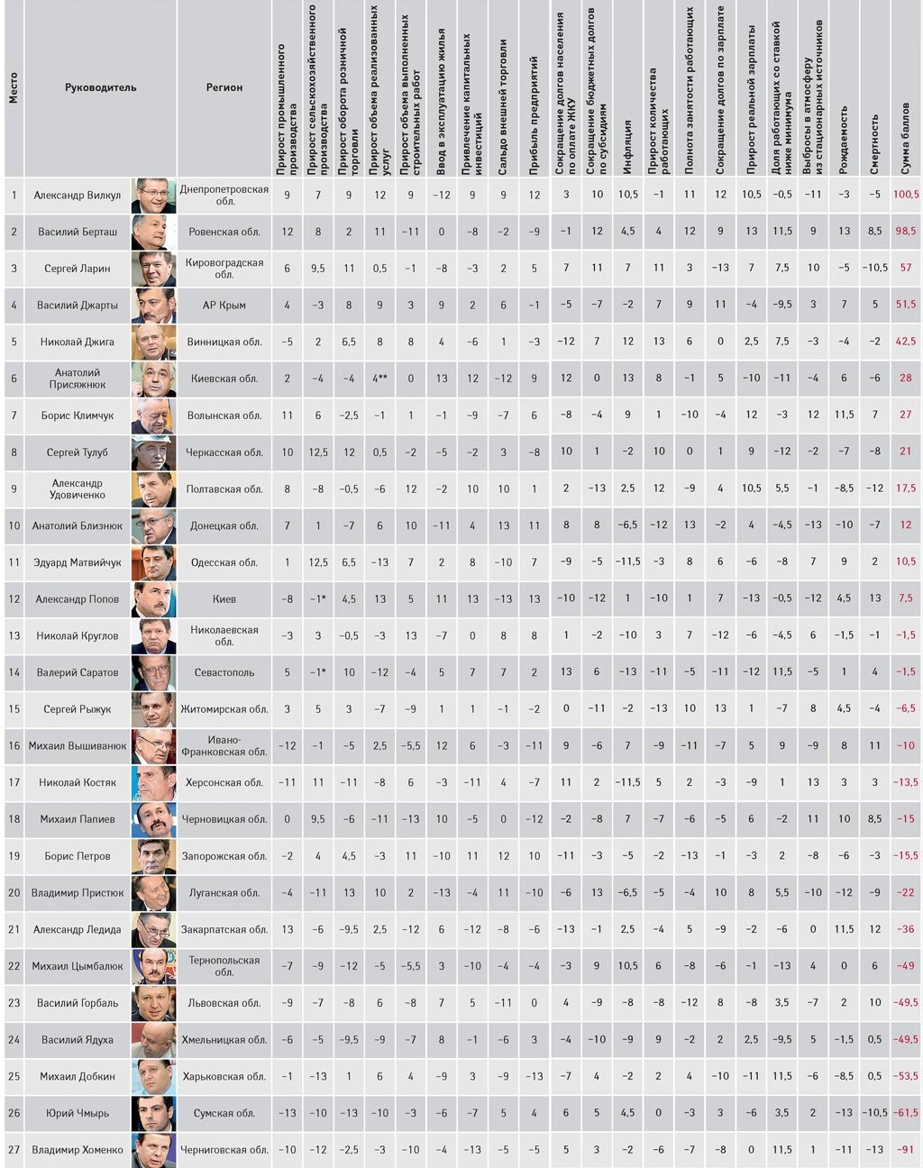 Загалом ефективність роботи губернаторів видання оцінювало за низкою показників – промислового та сільськогосподарського виробництва, оборотом зовнішньої торгівлі, об’ємом реалізованих послуг, виконаних будівельних робіт, введенням в експлуатацію житла, залученням капітальних інвестицій, сальдо зовнішньої торгівлі, прибутком підприємств у регіоні.