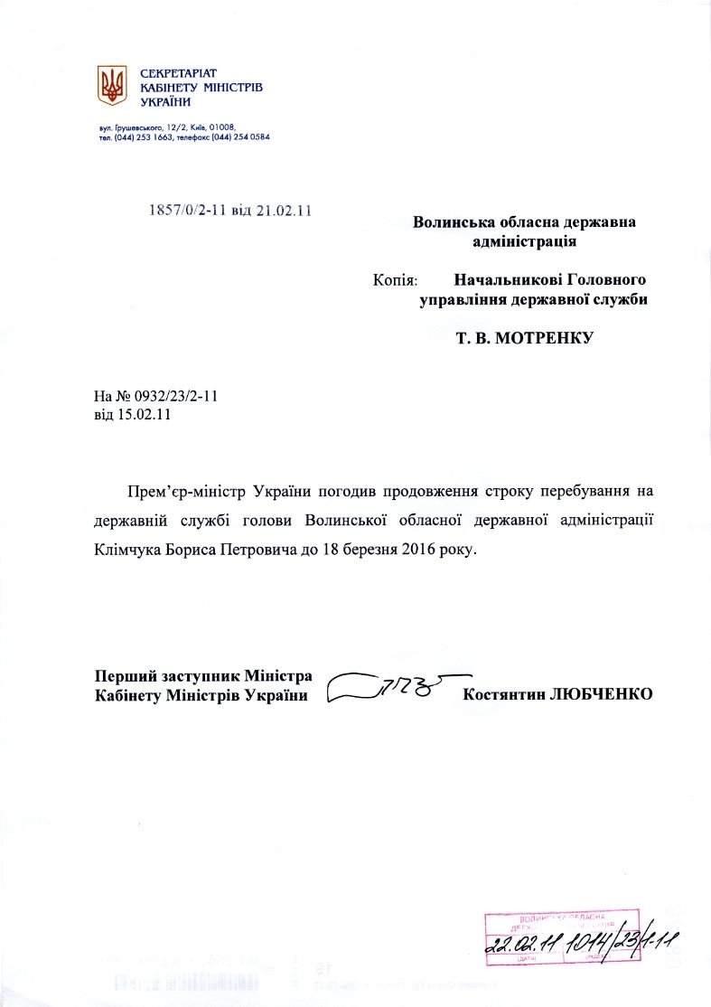 У прес-службі Волинської ОДА надали документ, який підтверджує слова Клімчука: