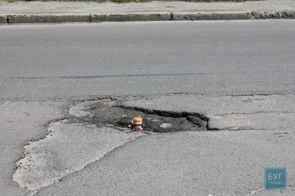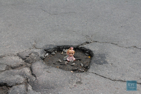 Нагадуємо, що “Інспектор Ляля” в сидячому положенні має зріст 6 сантиметрів, тому для є своєрідним мірилом, що візуально показує, які глибокі та небезпечні вибоїни на дорогах.