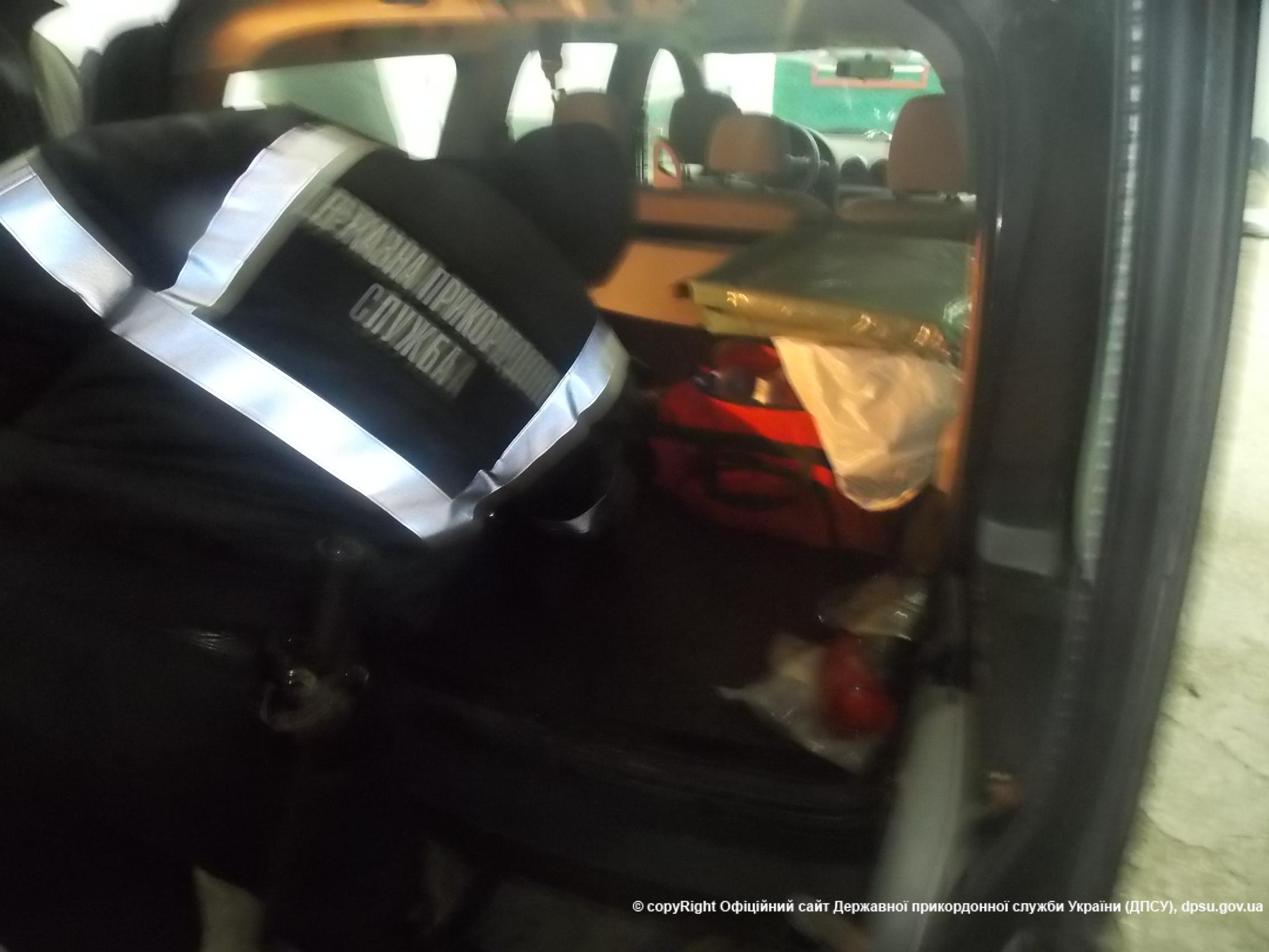 Під час процедури оформлення прикордонний наряд в багажнику автомобіля виявив замотані в простирадло шаблю, меч та 7 магазинів до гвинтівки М-4. Після цієї знахідки та подальшої перевірки на автівку спрацювала залучена до огляду службова собака Чіліта, яка натренована на пошук зброї.