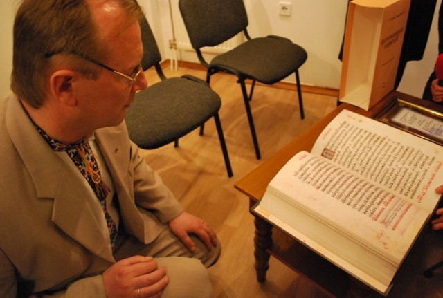 Опісля, коли кортеж предстоятеля поїхав, бажаючі змогли роздивитися факсимільну копію святині детальніше. Зокрема, видання зацікаво начальника департаменту культури та збереження історичної спадщини Луцької міськради Сергія Годлевського.