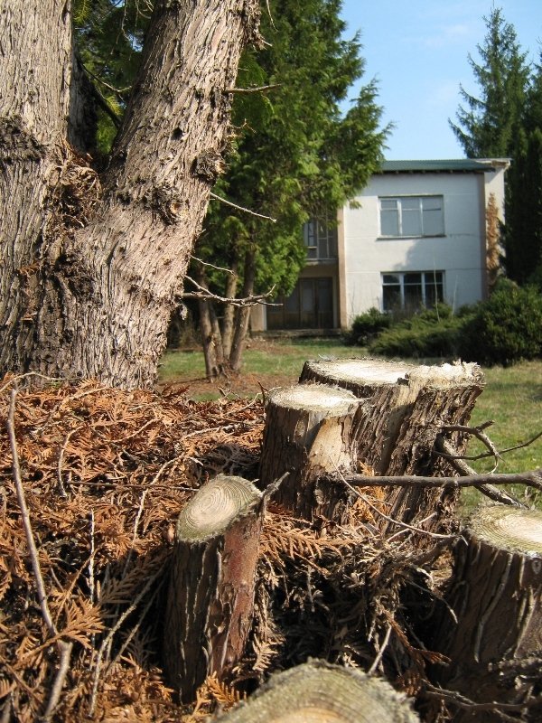 Біля лікувальних корпусів вигулькують пеньки від спиляних дерев.