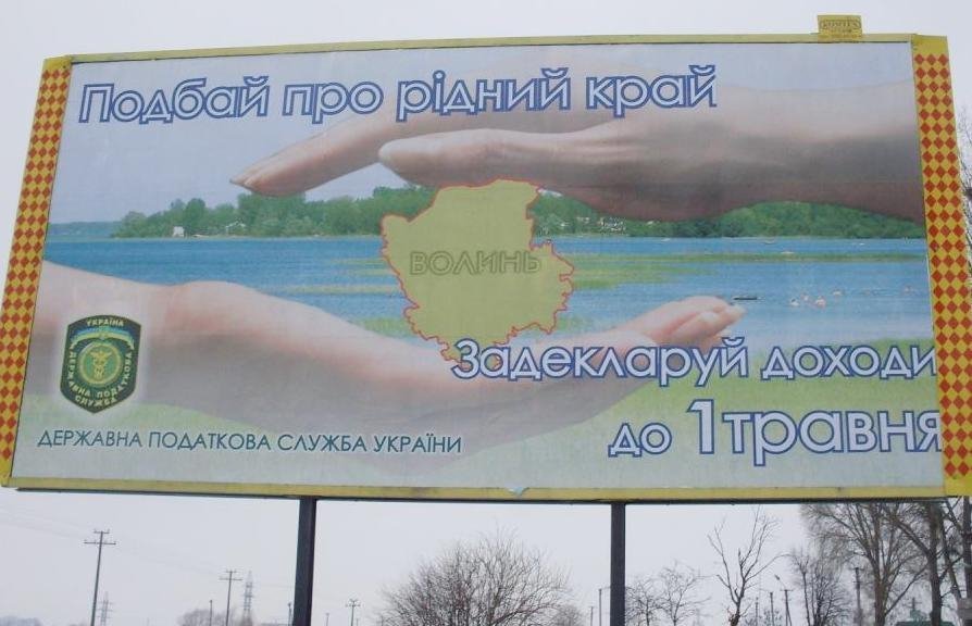 У податковій кажуть, що головна тема їх соціальної реклами – «турбота про малу батьківщину». «Подбай про рідний край – задекларуй доходи до 1 травня!», - кажуть їх бігборди.