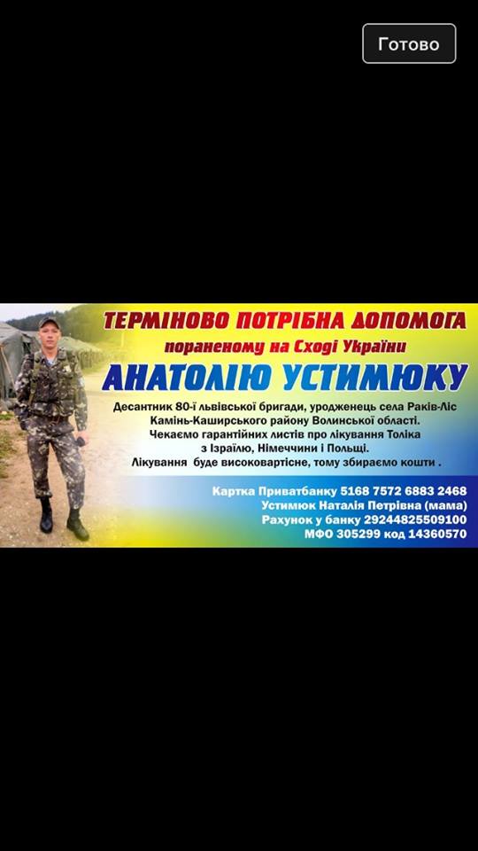 Друзи, нас тисячи!!!Пропоную вид кожнои людини по 100 грн. Завтра це може бути история кожного. Хлопець захищав нашу Батькивщину поки ми солодко спимо, смачно имо и т.д. Не будьте байдужими. В нього тильки починаеться життя!!!