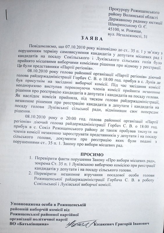 Волинський осередок ВО «Батьківщина» звернувся до органів прокуратури із заявою порушити кримінальну справу проти голови Рожищенської райдержадміністрації Сергія Горбача (на фото) та 12 членів Рожищенської виборчої комісії за фактом тиску на голову комісії Галину Стасюк та порушень виборчого законодавства.