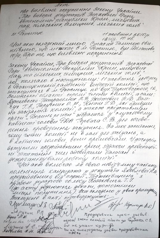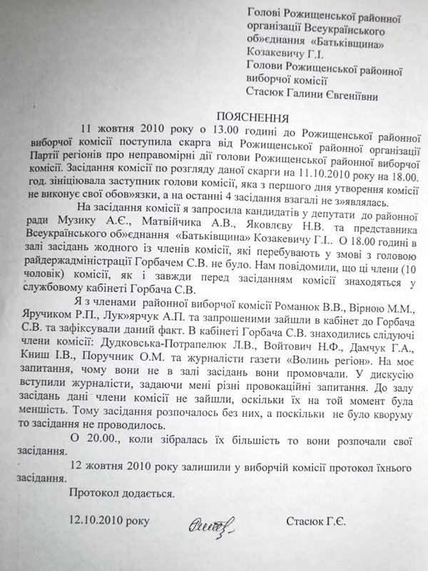 Однак о 20:00 12 членів комісії, серед яких були ті 11, яких не було о 18-й, провели раніше заплановане засідання. А вже 12 жовтня Галині Стасюк надали протокол з рішенням вечірнього засідання. У ньому йшлося про звернення до ЦВК про заміну секретаря та заступника Рожищенської ТВК, припинення повноважень голови ТВК та задоволення скарги місцевої організації Партії регіонів на дії голови ТВК Стасюк як такої що систематично не виконує своїх обов’язків.