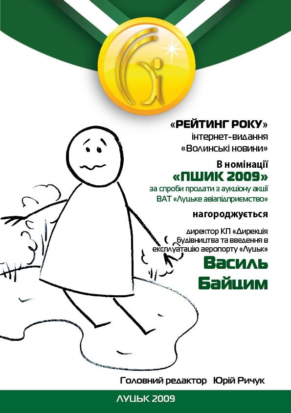 А що Василь Байцим уже не перший місяць «веде» тему аеропорту, і до того ж нещодавно його призначили директором комунального підприємства «Дирекція з будівництва та введення в експлуатацію аеропорту «Луцьк», то й диплом домінанта «ВН» вирішили виписати саме на нього.