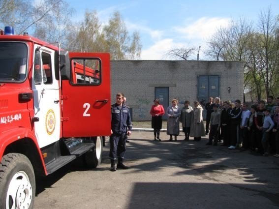 Бійці МНС продемонстрували школярам обладнання пожежного автомобіля - пожежну драбину, рукави та стволи, засоби індивідуального захисту.