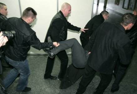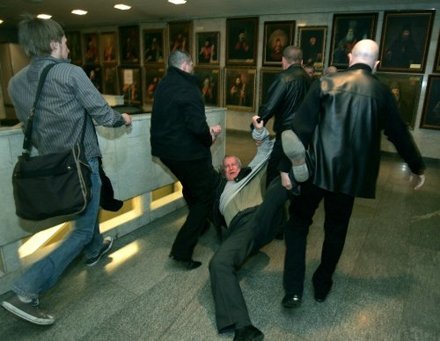 Як повідомляє УНІАН зі слів прес-служби київських міліціонерів, молодики увірвалися до демонстраційної зали і почали нищити експонати. Наразі всіх затриманих доставлено до Шевченківського районного управління міліції.