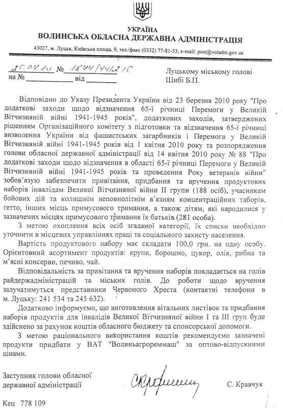 Колишній заступник голови Волинської ОДА Святослав Кравчук своїм листом зобов’язав Луцьку міську раду забезпечити привітання та придбання продуктових наборів для ветеранів Великої Вітчизняної війни до 65-ї річниці перемоги, а також рекомендував придбати ці продукти у конкретного підприємства – «Волиньагрореммаш».