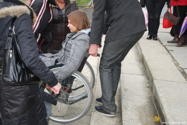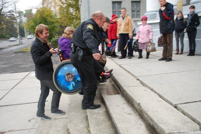 Для того, щоб потрапити у приміщення потрібно не менше двох людей - щоб підняти коляску та перенести її через високі сходи будівлі.