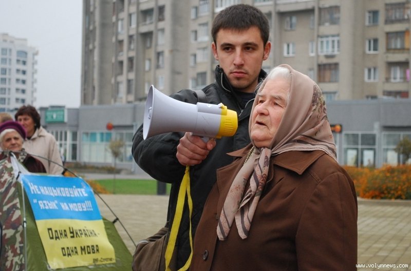 Більше півсотні людей прийшли під стіни облдержадміністрації, аби висловити своє «фе» законопроекту «Про мови в Україні», згідно з яким в державі можуть запровадити російсько-українську двомовність.