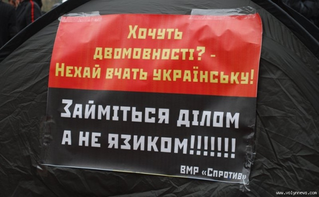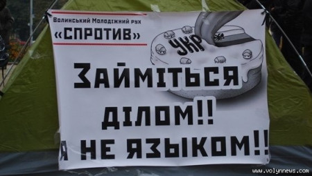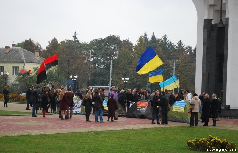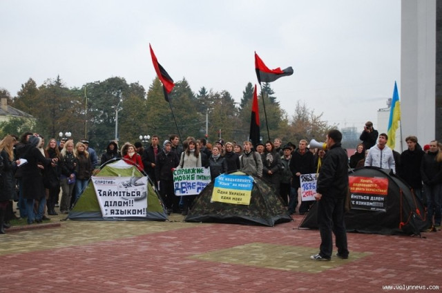 В Луцьку на акцію прийшла здебільшого молодь, яка об’єдналась в так званий молодіжний рух «Спротив». Активісти встановили перед стінами ОДА чотири намети, прикріпивши на них банери з гаслами проти двомовності. Захід проводився без партійних прапорів та символіки.