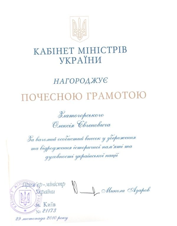 У документі, підписаному прем’єр-міністром України Миколою Азаровим, йдеться: «За вагомий особистий внесок у збереження та відродження історичної пам’яті та духовності української нації», - повідомили у прес-центрі ДП «Волинські старожитності».