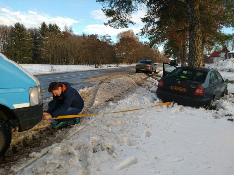 "Сьогодні опинились по іншу сторону барикад. Місце подій село Березовичі. Нідерландець не був готовий до таких умов на дорозі, щастям оминув дерево. Не мав ні троса, ні знання української:) На запитання нід хелп?, закивав і підбадьорився.