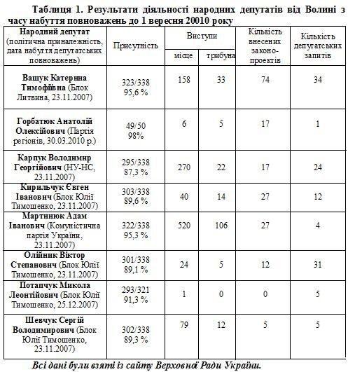 Таким є результат моніторингу парламентської діяльності народних депутатів Волині за період з 23 листопада 2007 до 1 вересня 2010 року, проведеного Асоціацією молодих політологів і політиків, - повідомив експерт Асоціації Ігор Куц.