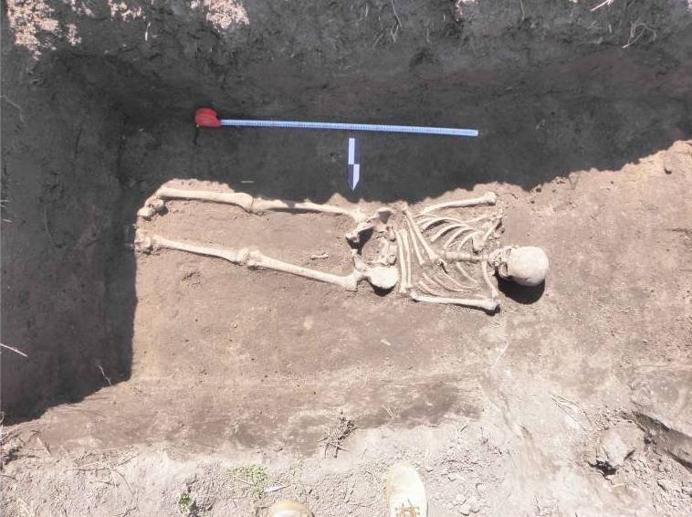 На місці виявлення закладено шурф, розмірами 1,2×0,7 метра, орієнтований по лінії північ-південь. Кістяк людини лежав у випростаній позі, головою на схід. Руки складені на грудях. Поряд із кістяком траплялися зотлілі шматки дерева. Біля голови знайдено залізну оббивку прикладу гвинтівки.