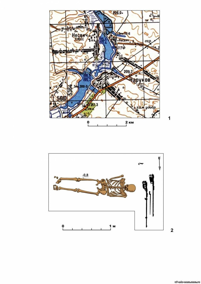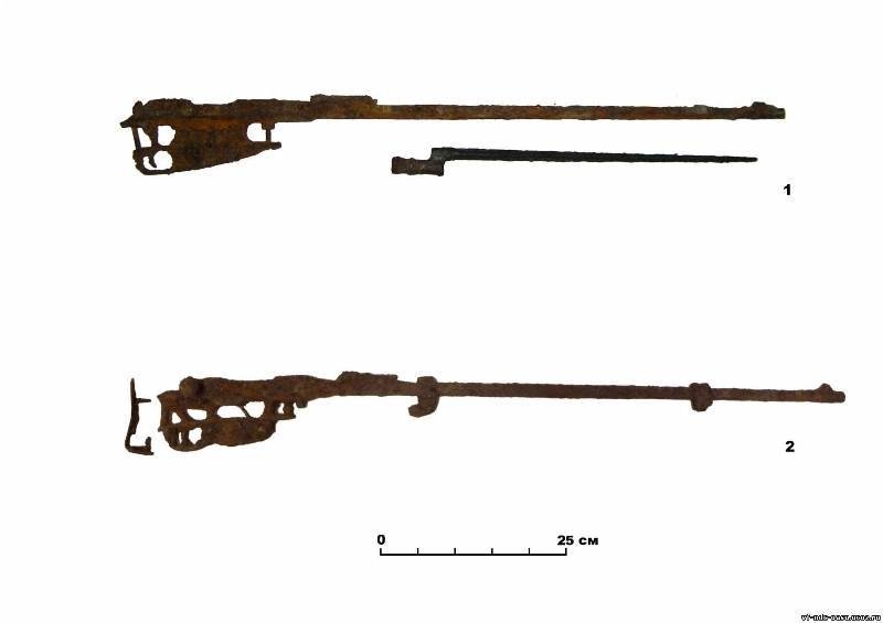 Біля голови покійника були закопані дві гвинтівки системи Манліхер і Мосіна. Вони покриті корозією, дерев’яні деталі зброї не збереглися. З упевненістю можна сказати, що поховання належить до середини ХХ століття.