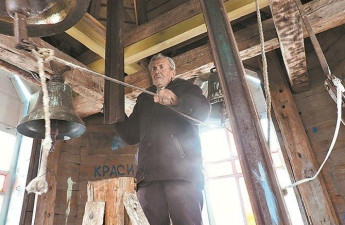 Вузькими дерев'яними сходами 82-річний Іван Сорока швидко і без задишки піднімається на дзвіницю церкви Святого Михайла селища Липн...