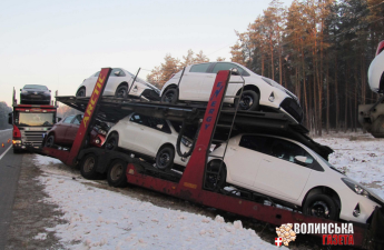 На Волині тягач, навантажений новенькими «Тойотами», злетів у кювет