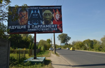 На білборді «Радикальної партії» видно Президента Росії Володимира Путіна і червоні вила. На ілюстрації напис «Переможе добро»