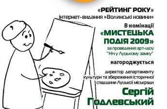 Невзирая на кризис в этом году развлекательных неординарных мероприятий на Волыни были достаточно. «ВН» предложили на усмотрение читателям десять позиций на звание «Художественное событие 2009». С результатом в 25,8% голосов читателей и 8 голосов экспертов победу добыло в борьбе арт-шоу «Ночь в Луцком замке».