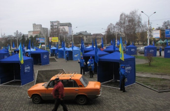 Сегодня ночью на площади около памятника Грушевского развернулся бело-голубой лагерь сторонников Виктора Януковича, который сегодня в 11 часов начнет свое выступление в кинотеатре «Проминь».
