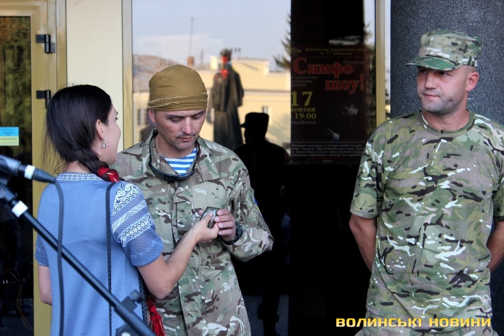 Боєць Самурай зазначив, що не міг подумати, що у віці 39 років, ставши вже батьком двох дітей, піде воювати через те, що агресор посягне на нашу незалежність. Він очолює взвод та назвав основною своєю задачею привезти хлопців цілими додому. Боєць зізнався, що не хоче мститися та не має бажання когось вбивати, проте хоче, щоб ті хлопці, які полягли, загинули не марно. Капітан запасу зараз воює, як простий рядовий, на рівних прикриваючи спину бійцям та вважає за честь бути поруч зі справжніми патріотами. Він попросив лучан бути справжніми громадянами України, телефонувати добровольцям та молитися за них.
