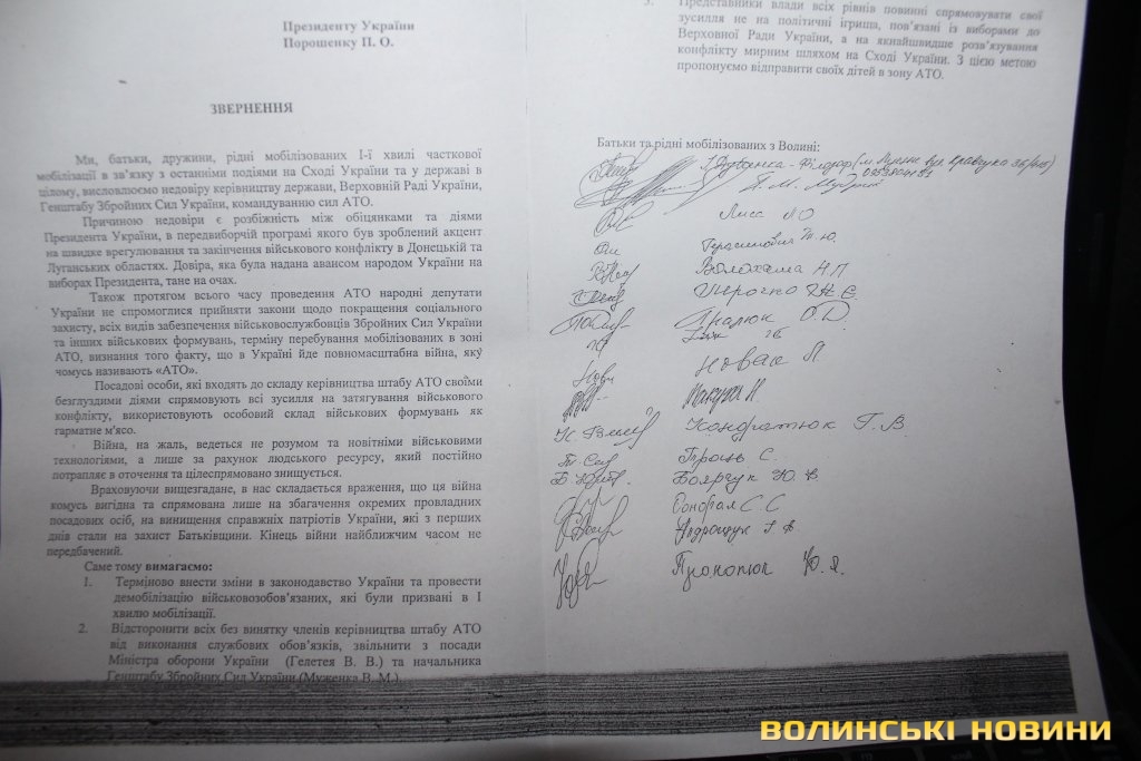 Представник батьків Ярослав Мудрик повідомив, що родичів військових не влаштовує відповідь Президента, отримана після попереднього звернення та невиконання їхніх вимог. Тоді вимагали впровадити воєнний стан на території всієї України, що визначило б Росію, як військового агресора. Також пропонували підвищити відповідальність за дії представників керівництва АТО.