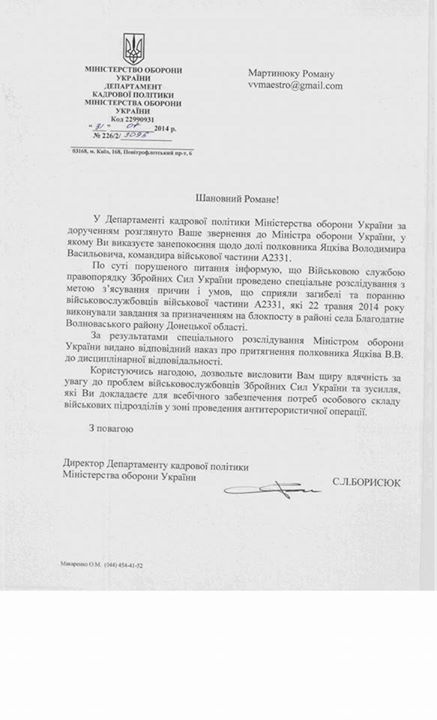 «Шановний пане Міністр оборони України Валерій Гелетей. Прошу Вашого особистого втручання у долю командира в/ч А2331 51ОМБР - полковника Яцківа Володимира Васильовича.
