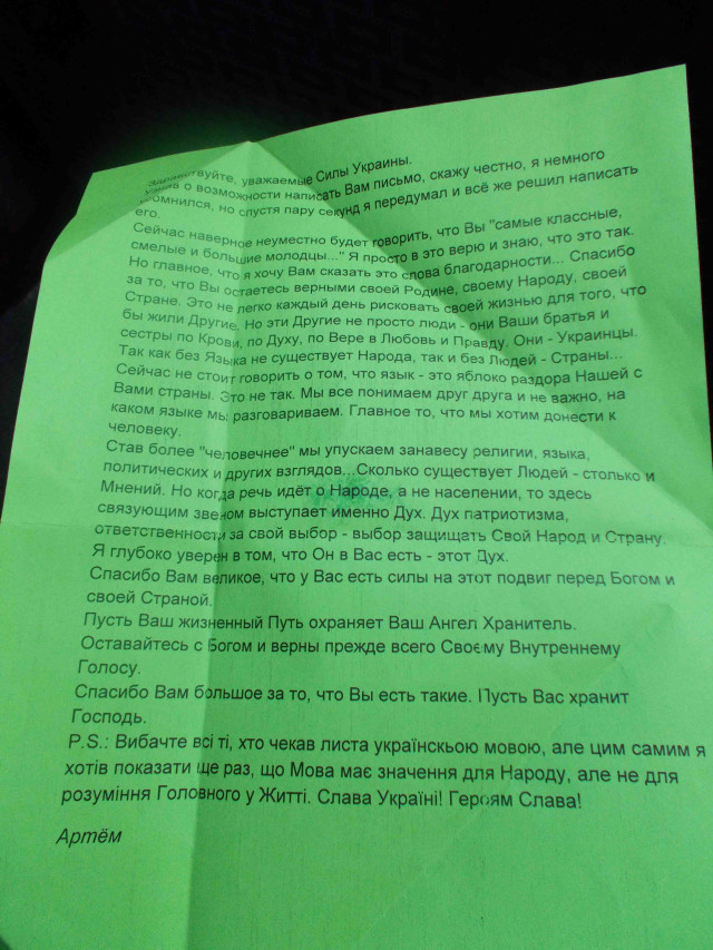 А ще – до цих жахаючих речей додадуть кольорові листи вдячності, які надходили бійцям української армії зі всієї України та за кордону, і купу дитячих малюнків. Вадим Дорофєєнко приїхав на рідну Волинь побачити дружину і доньку лише на 10 діб, а потім повернеться назад на Схід. Каже, що має великий борг перед своїми побратимами, які вже, на жаль, не стануть разом із ним в один стрій. З ними він знаходився два з половиною місяця в облозі сепаратистів, коли йшов визволяти місто Краматорськ. Тоді майже 20 днів під шаленою спекою та масивними обстрілами проросійських найманців вони вистояли без води, мали обмаль їжі та боєприпасів.
