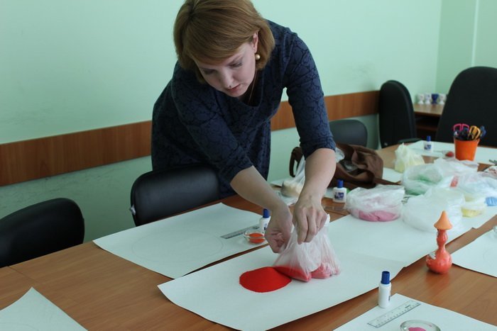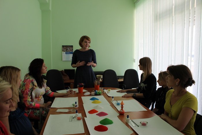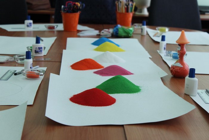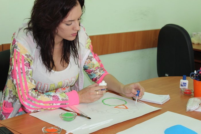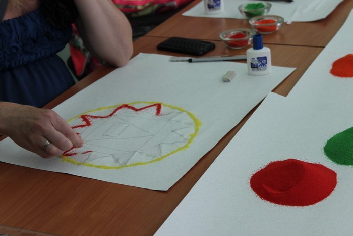 Під час першого заняття — мандало терапії, учасники спочатку намалювали геометричні фігури, що їм імпонують, опісля посипали контури піском різних кольорів.