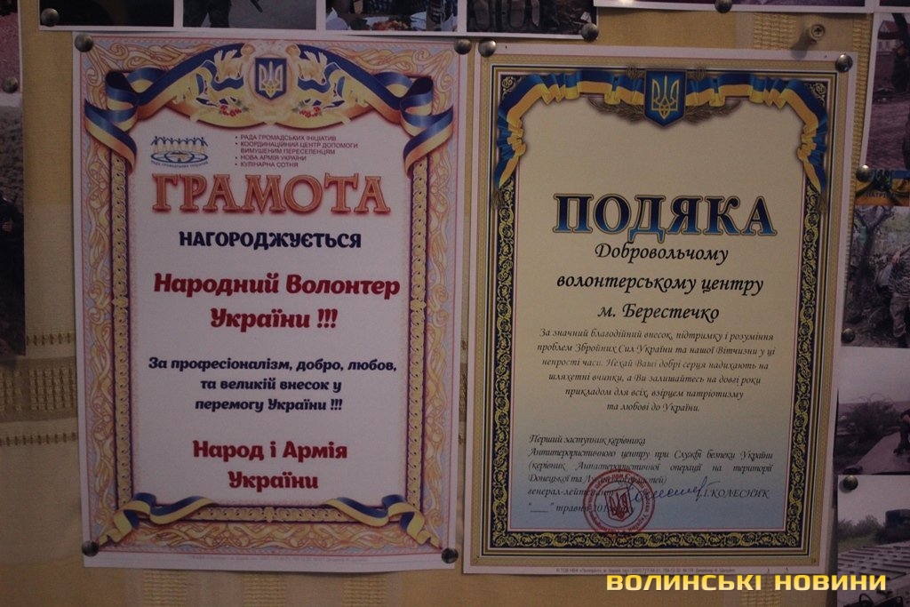 «Все почалось із того, що три наших колеги пішли воювати на фронт. І ми вирішили їм допомогти. З березня ходили по магазинах, підприємствах, і просили грошей. Купували і відсилали. Але то був початок. Офіційно волонтерський центр сформувався у вересні 2014 року. Тоді я й знайшов однодумців. Нас було 5 чоловік. Почали працювати. З’явились зв’язки з головами сільських рад, почали збирати допомогу конкретно й цілеспрямовано. Усюди розмістили офіційні скриньки. Уже в лютому ми зібрали 15 тон продуктів, які передали через ГО «Самооборона Волині» і «Серце патріота» на передову. Також найпершими з тих, з ким ми почали співпрацювати, була Волинська обласна спілка ветеранів Афганістану і Григорій Павлович. Через них ми діставали бронежилети, «розгрузки» й іншу амуніцію для бійців», – каже волонтер.Волонтерка, побувавши декілька разів на сході, «записалась у армію»