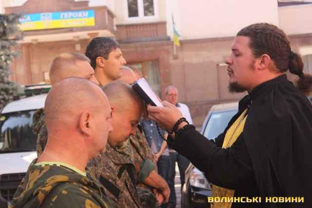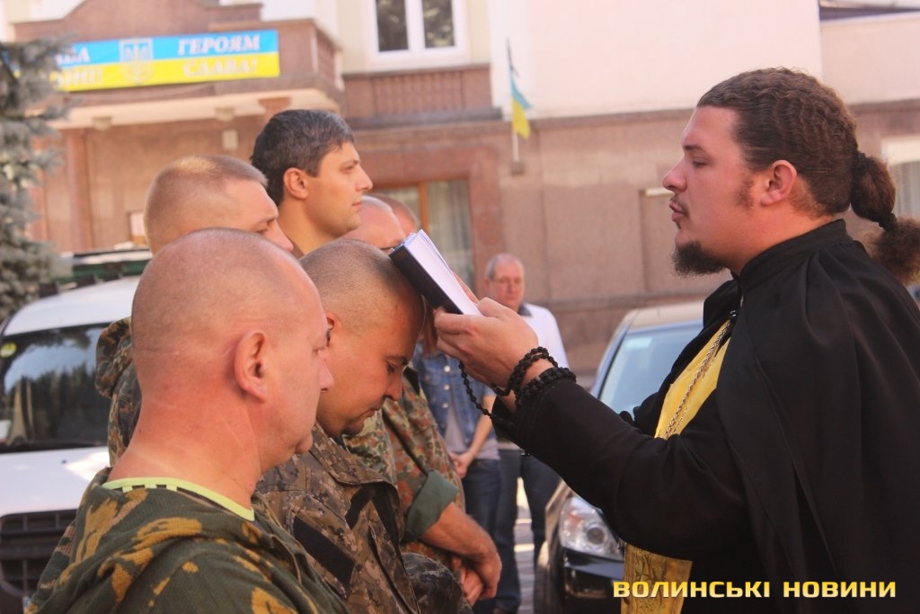 Молитву перед строєм бійців прочитав ієромонах Никодим. Він зазначив, що одночасно відчуває і скорботу, і радість. Скорботу – тому що хлопці мусять йти на таке завдання, а радість – тому що бійці не бояться вирушати на Схід. Він подякував добровольцям та побажав, щоб Господь усюди їх оберігав. А завдання тих, хто залишається вдома, з його слів – забезпечити бійцям міцний молитовний тил. Він закликав усіх щодня молитися за добровольців.