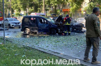 Ворог поцілив в автівки у центрі Сум. На місці влучання вщент згоріли два автомобілі. Тип зброї встановлюють, наслідки атаки зʼясовують. На місці працюють рятувальники.