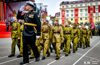 У російському Владивостоці влаштували дитячий парад «Правнуки Перемоги» – у ньому взяли участь 1500 учнів молодших класів, яких вбрали у форму різних родів військ.