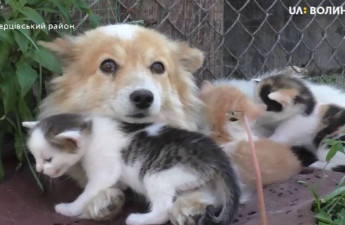 На одному з обійсть у селі Озеро Ківерцівського району собака вигодовує кошенят. Собака на кличку Білка відібрала у кицьки дитинчат, бо вважає їх за своїх